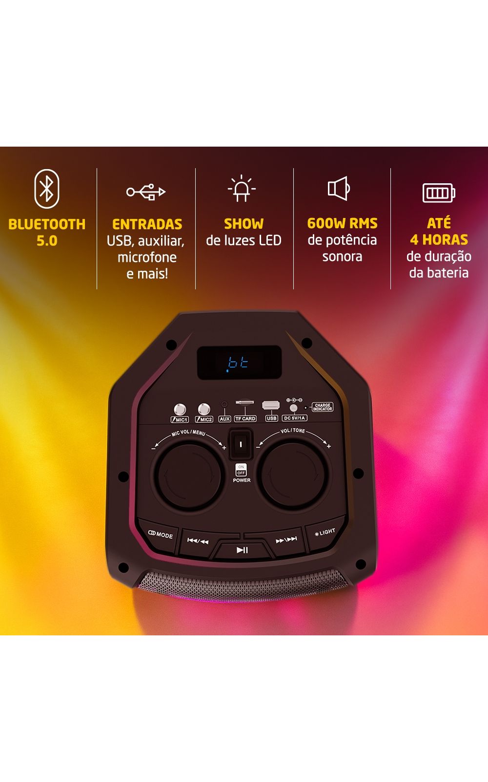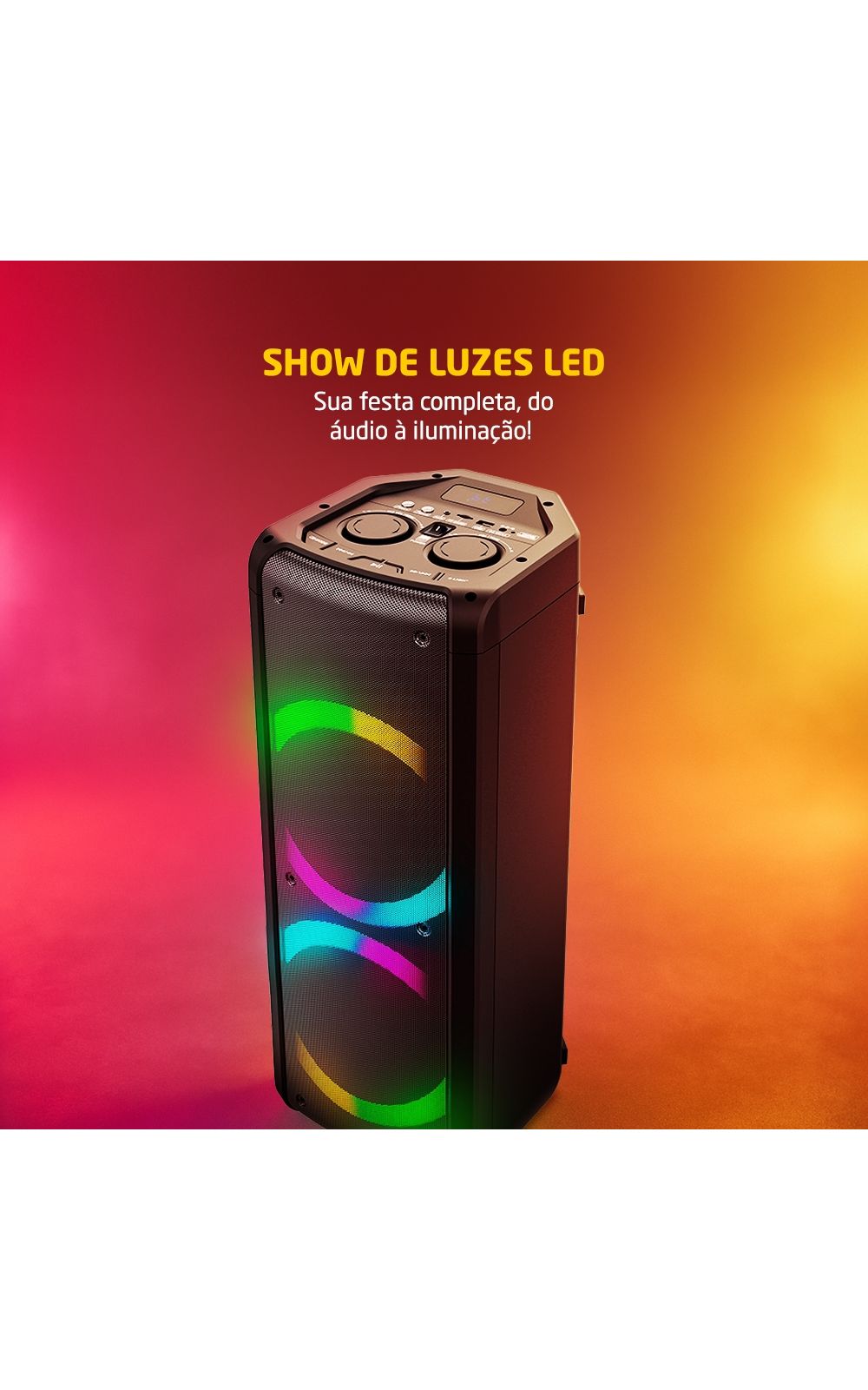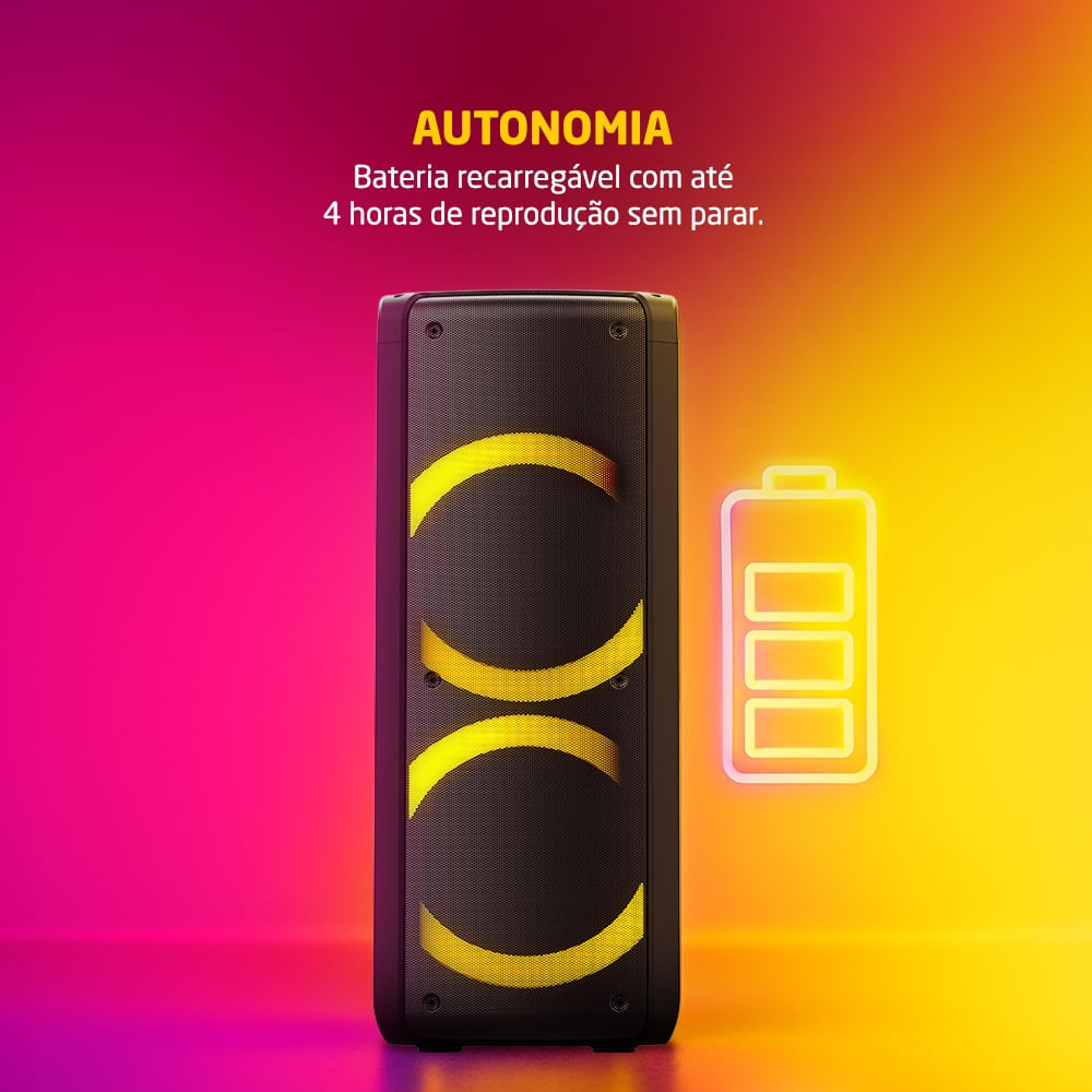 É uma caixa de som com 2 woofers de 6,5 polegadas. Ela conta com 600W de potência em 2 alto-falantes que trazem alta fidelidade ao som.
