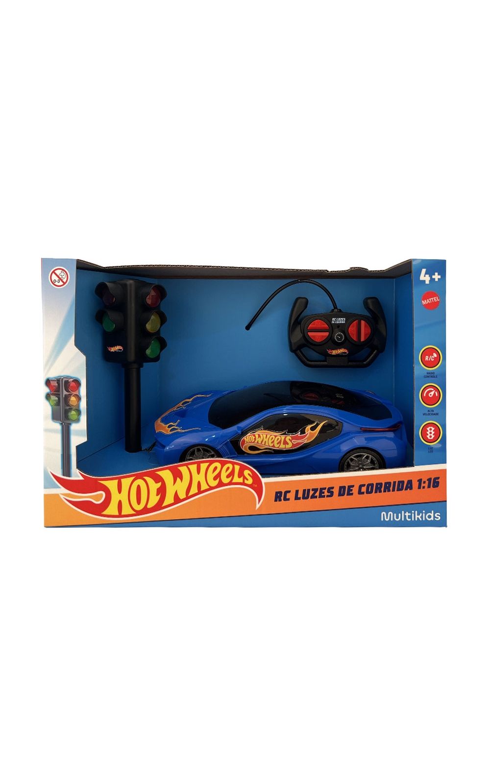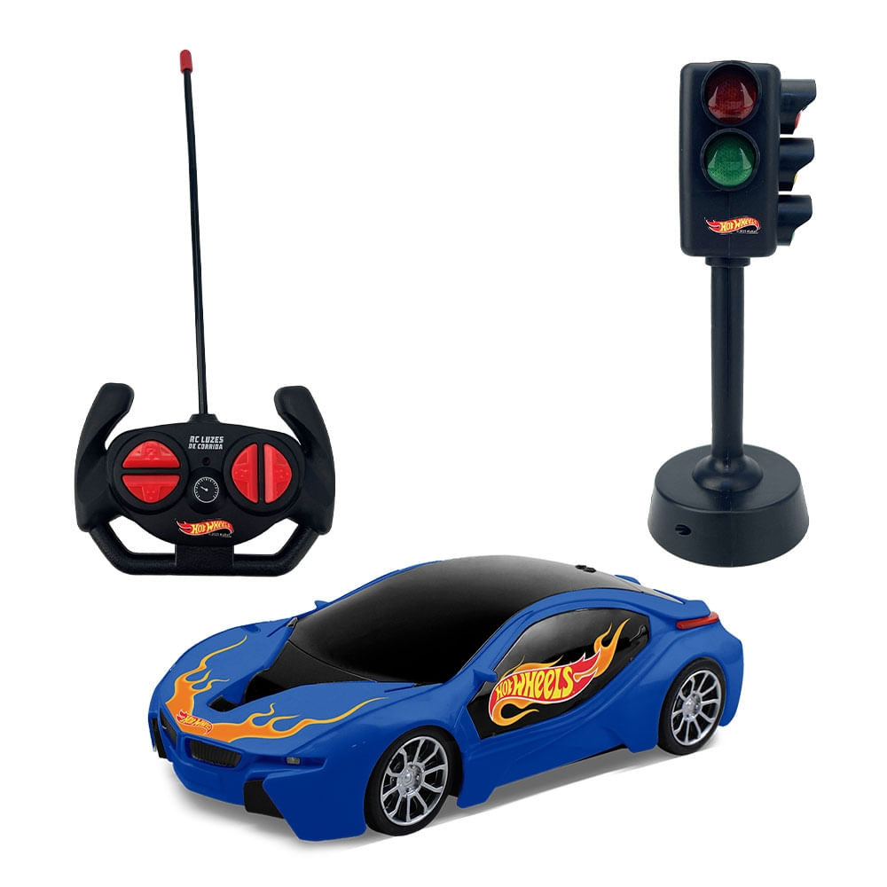 Sinta a adrenalina das pistas com o 1:16 HOT WHEELS RC LUZES DE CORRIDA - BRANCO E AZUL.