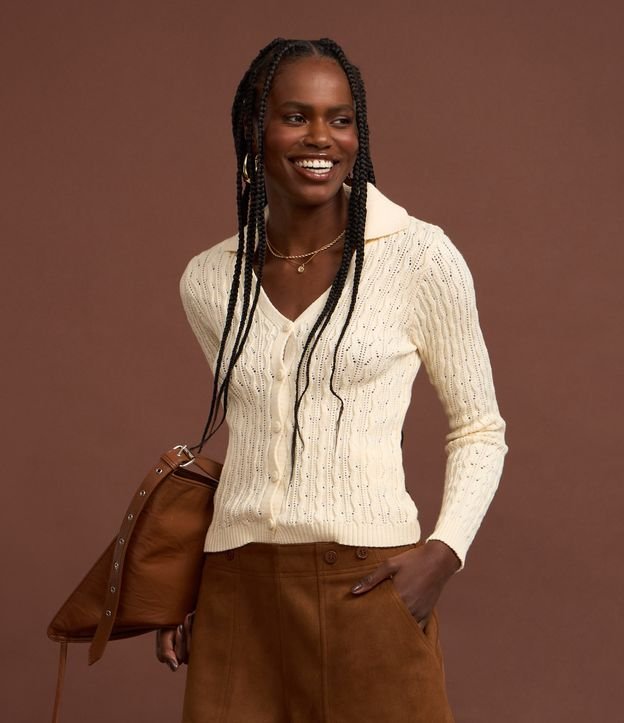 Blusa manga longa, confeccionada em tricô leve em boas práticas ambientais, decote v com golinha polo e abotoamento frontal.
