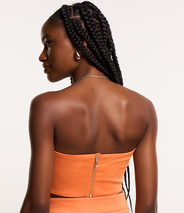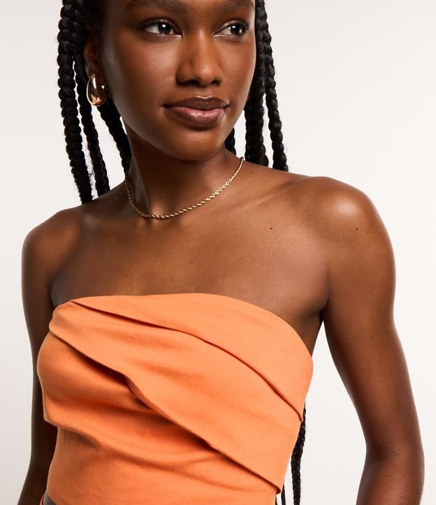 Blusa cropped, com decote tomara que caia de pregas assimétricas e fechamento por zíper nas costas.