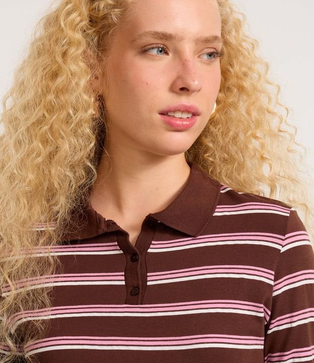 Blusa polo com listras contrastantes, botões no decote e manga longa.