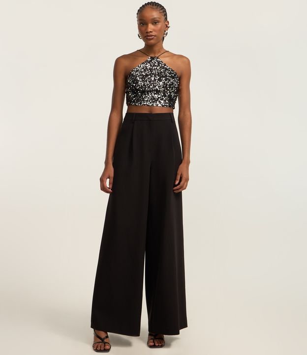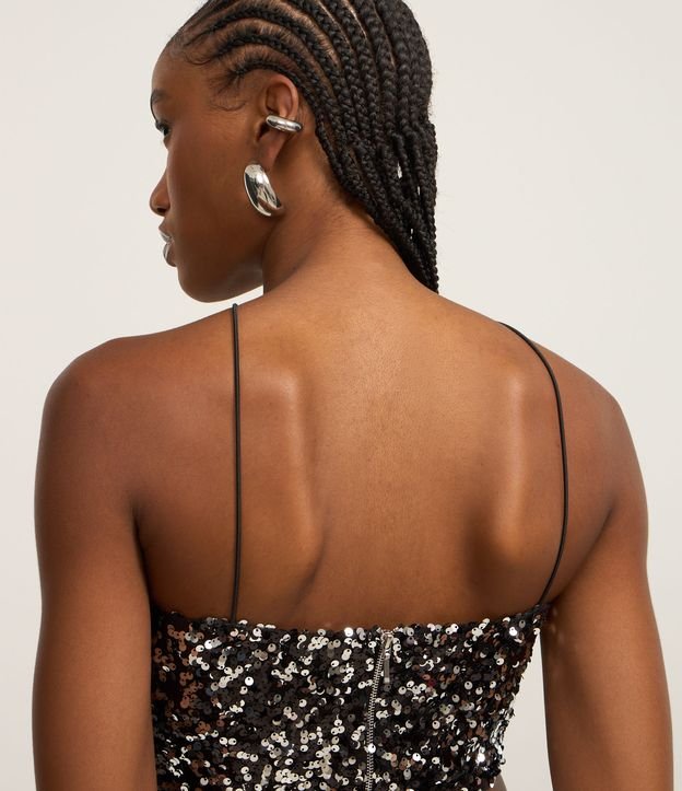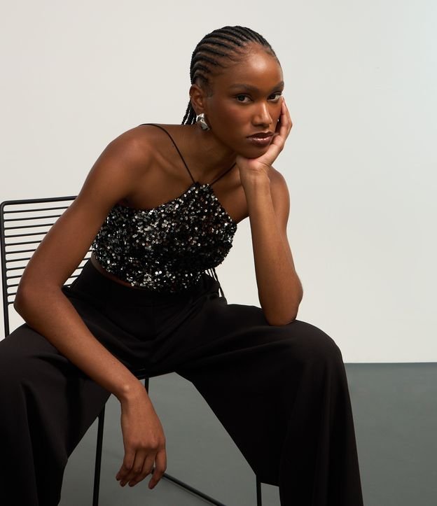 Blusa cropped com alcinha fina, decote halter com base em veludo e com paetês metalizados.