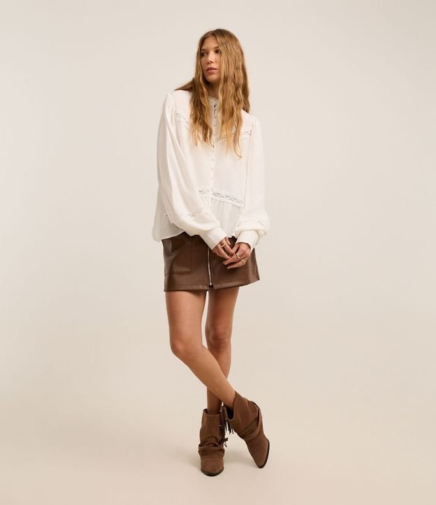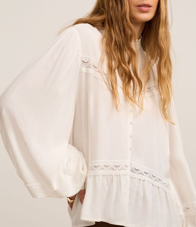 Camisa boho de mangas longas bufantes, confeccionada em cambraia, com gola padre com sobreposições bordadas, botões frontais, punhos largos com botões e recortes com entremeios rendados. Este produto possui viscose certificada em sua composição, sendo ambientalmente mais responsável.