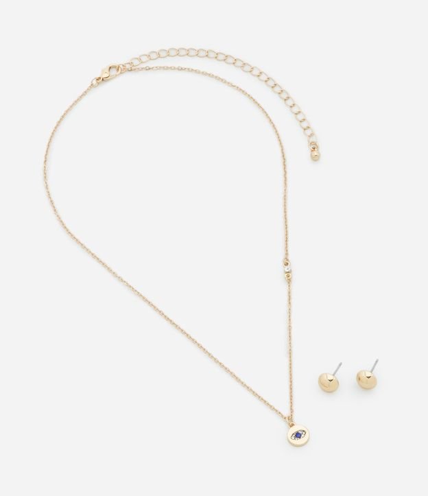 Conjunto de colar curto com pingente de olho e strass acompanhado de par de brincos botão. Produto confeccionado com metal reciclado.