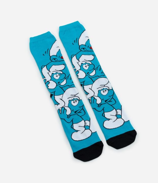 Meia masculina, modelo cano alto, confeccionada em algodão mais sustentável, com estampa dos personagens Smurfs.