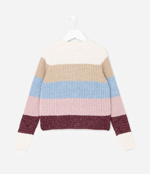 Casaco infantil confeccionado em chenille encorpado, com modelo regular, gola redonda e superfície texturizada. Possui listras em color block e barras caneladas que proporcionam conforto térmico, sendo ideal para composições aconchegantes nos dias mais frios.