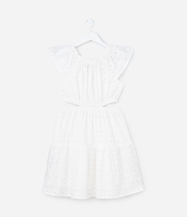 Vestido infantil confeccionado em laise mais sustentável, no modelo Marias. Possui gola redonda, com elástico, sem mangas, com babadinhos, cut out lateral e texturizado.